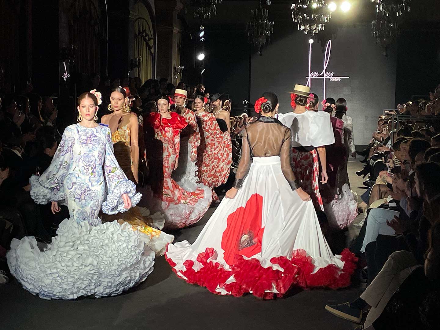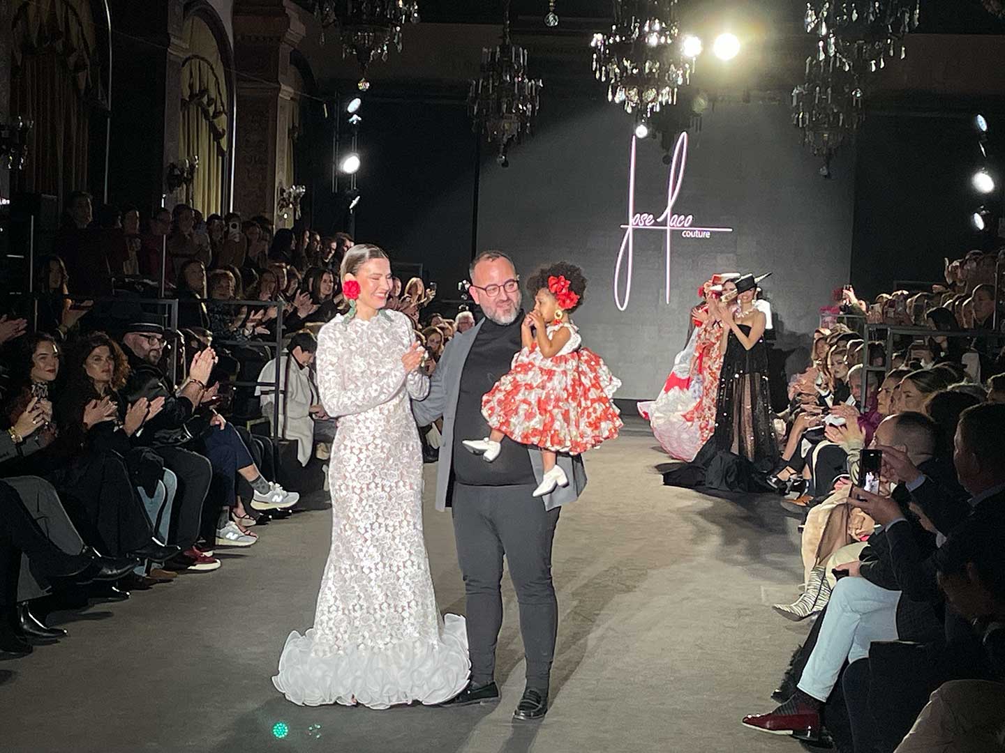 La colección de José Paco Couture se denomina “Trece”, un número que “tiene mucho que ver con momentos muy significativos de mi vida”, declaró el diseñador. La dedicó a su hija, Elisa, que participó en el desfile como una modelo más, entre los aplausos del público. El autor definió sus diseños de este año como “una oda a la tradición y la vanguardia, en la que se fusiona la esencia del flamenco con una estética contemporánea”. Y añadió que la colección está inspirada en la naturaleza, y que “las amapolas y los claveles cobran vida en los vestidos, simbolizando el fuego y la vitalidad del arte flamenco”.