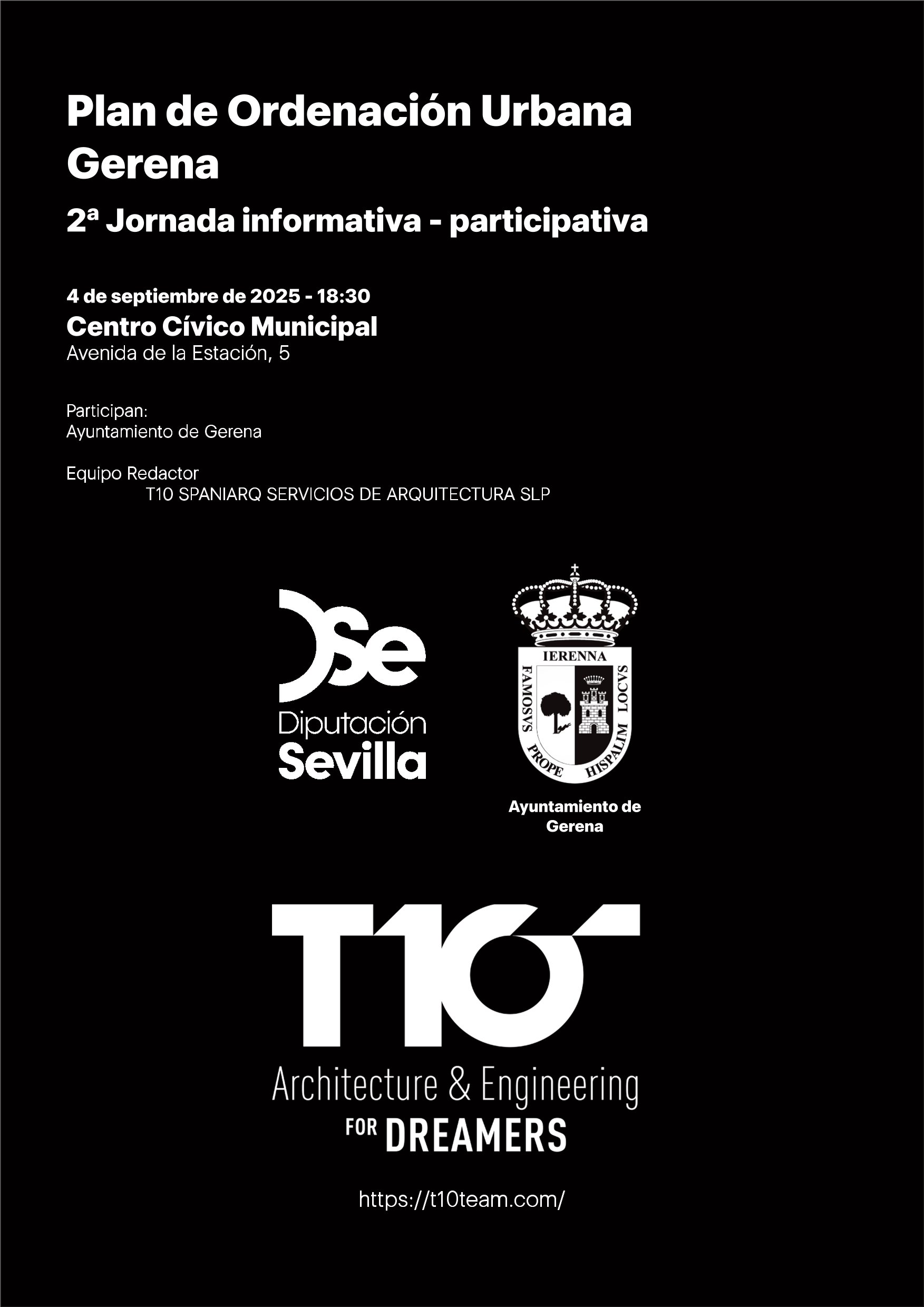 El próximo 4 de septiembre de 2025, a las 18:30 horas, en el Centro Cívico sito en Avenida de la Estación nº. 5 tendrá lugar la 2ª jornada informativa-participativa del Plan de Ordenación Urbana de Gerena en la que participarán el Equipo Redactor, T10 SPANIARQ SERVICIOS DE ARQUITECTURA SLP, y los servicios técnicos de urbanismo del Ayuntamiento de Gerena.