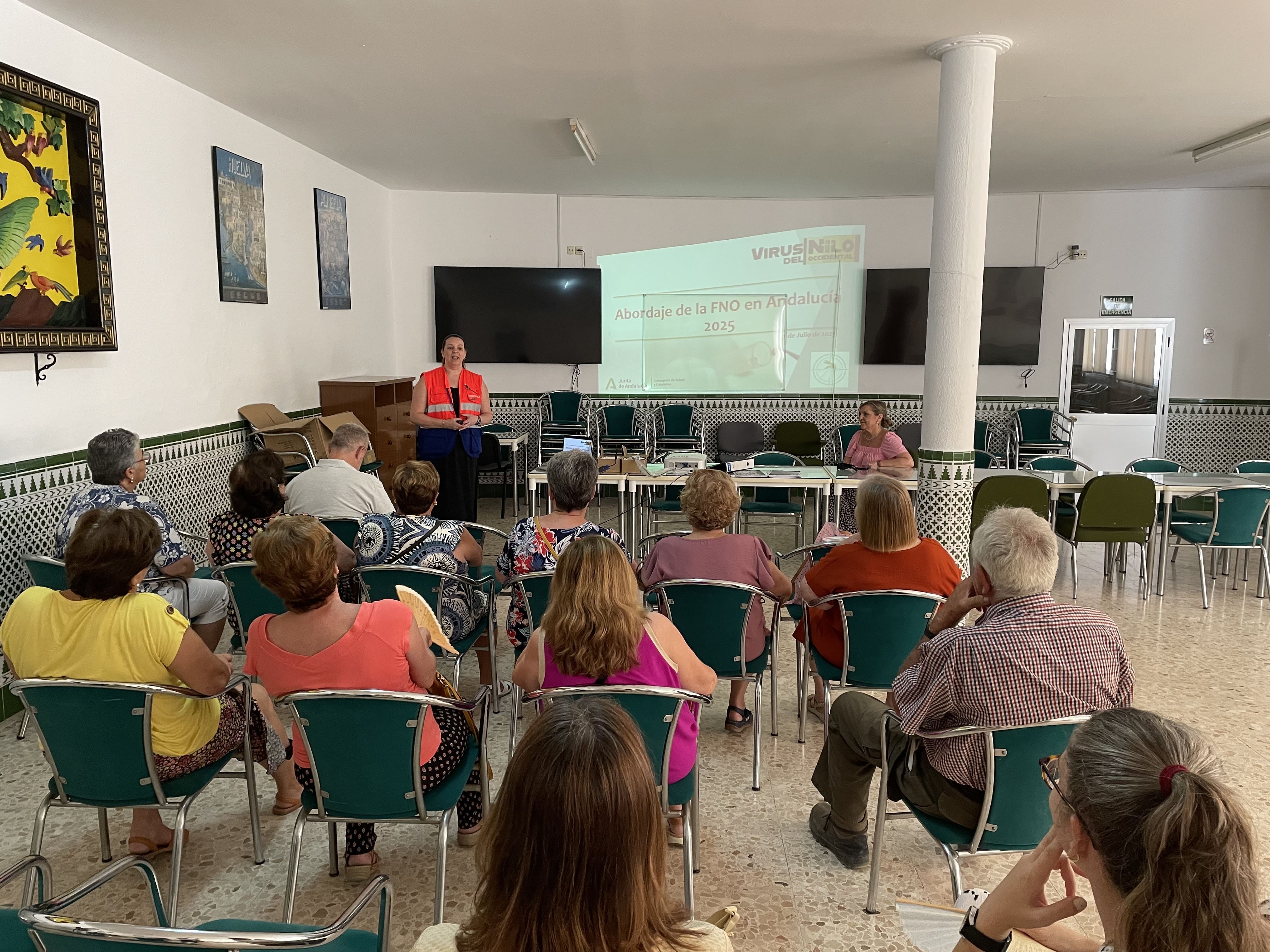 El Hogar Municipal de Pensionistas de Gerena acogió este jueves una charla informativa sobre la fiebre del Nilo Occidental, enfermedad provocada por un virus que se transmite por picadura de mosquitos. Esta actividad de concienciación forma parte de la campaña de prevención del Ayuntamiento y la Consejería de Salud de la Junta de Andalucía, y está dirigida especialmente a las personas más vulnerables.